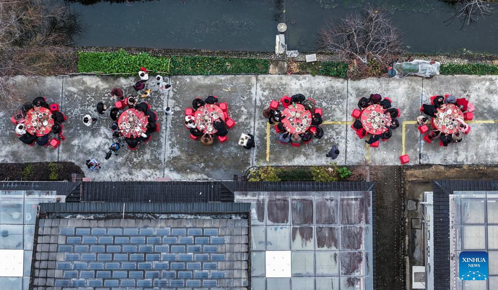An aerial drone photo taken on Feb. 1, 2026 shows people dining on the street in Lianhua Township, east China's Zhejiang Province. A Spring Festival cultural event was held here with great enthusiasm on Sunday. Local residents and tourists enjoyed the festive market, viewed the local art exhibition, participated in traditional games, and savored local foods. [Photo/Xinhua]