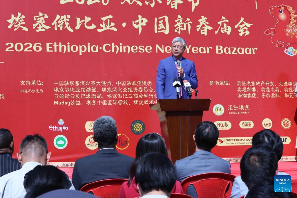 Chinese Ambassador to Ethiopia Chen Hai speaks during the 2026 Chinese New Year Bazaar in Addis Ababa, the capital of Ethiopia, on Feb. 1, 2026. The 2026 Chinese New Year Bazaar was held Sunday in Addis Ababa, the capital of Ethiopia, to celebrate the upcoming Spring Festival, or the Chinese New Year. [Photo/Xinhua]