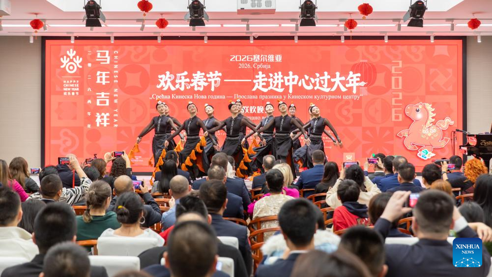 Artists stage a folk dance at the Chinese Cultural Center in Belgrade, Serbia, Jan. 30, 2026. An immersive music and opera gala at the Chinese Cultural Center in Belgrade drew hundreds of attendees on Friday evening, marking the launch of the 2026 Chinese New Year celebrations in Serbia. [Photo/Xinhua]