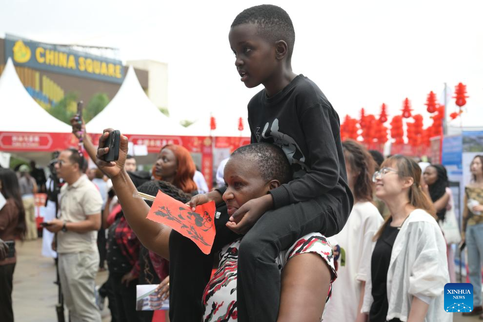 A woman takes photos as she watches a performance with her son at the 2026 Chinese New Year Gala in Nairobi, Kenya, Feb. 8, 2026. [Photo/Xinhua]