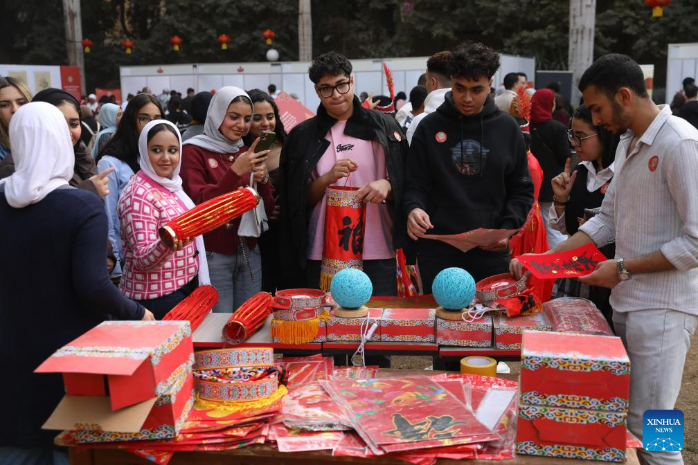 People view Spring Festival decorations during a 2026 Chinese Spring Festival celebration in Cairo, Egypt, on Feb. 8, 2026. [Photo/Xinhua]