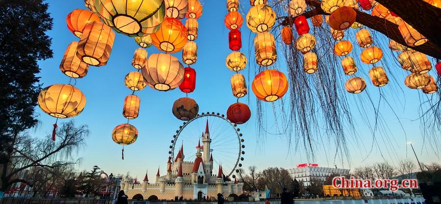 Lanterns glow against the Ferris wheel and castle-themed architecture of Shijingshan Amusement Park in Beijing, creating a joyful New Year ambiance, Feb. 7, 2026. [Photo by Xu Xiaoxuan/China.org.cn]