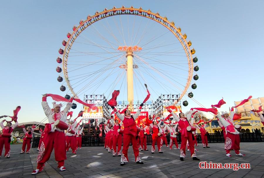 Performers present Ansai waist drum, a national intangible cultural heritage, in front of the Ferris wheel at Shijingshan Amusement Park in Beijing, Feb. 7, 2026. [Photo by Xu Xiaoxuan/China.org.cn]