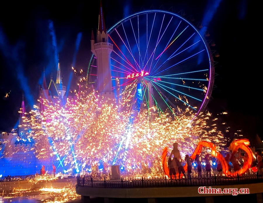 A dazzling "datiehua" (molten iron fireworks) display unfolds as performers stage a dragon dance at Shijingshan Amusement Park in Beijing, Feb. 7, 2026. [Photo by Xu Xiaoxuan/China.org.cn]