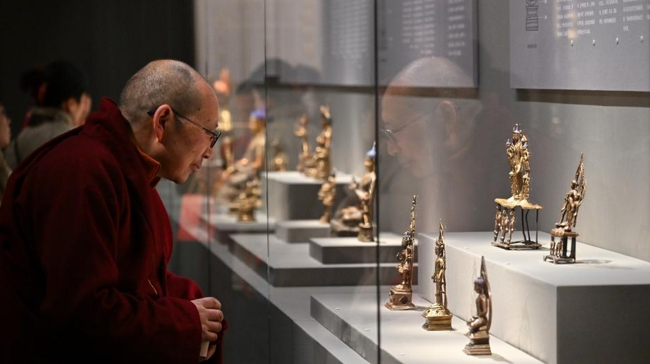 People visit the exhibition "Beyond Time: the history, culture and art of Sakya Monastery" at the Palace Museum in Beijing, capital of China, Feb. 9, 2026. The exhibition, which will last till May 10, showcases over 200 relics reflecting the history, culture and art of Sakya Monastery, the earliest monastery of the Sakya Sect of the Tibetan Buddhism. [Photo/Xinhua]