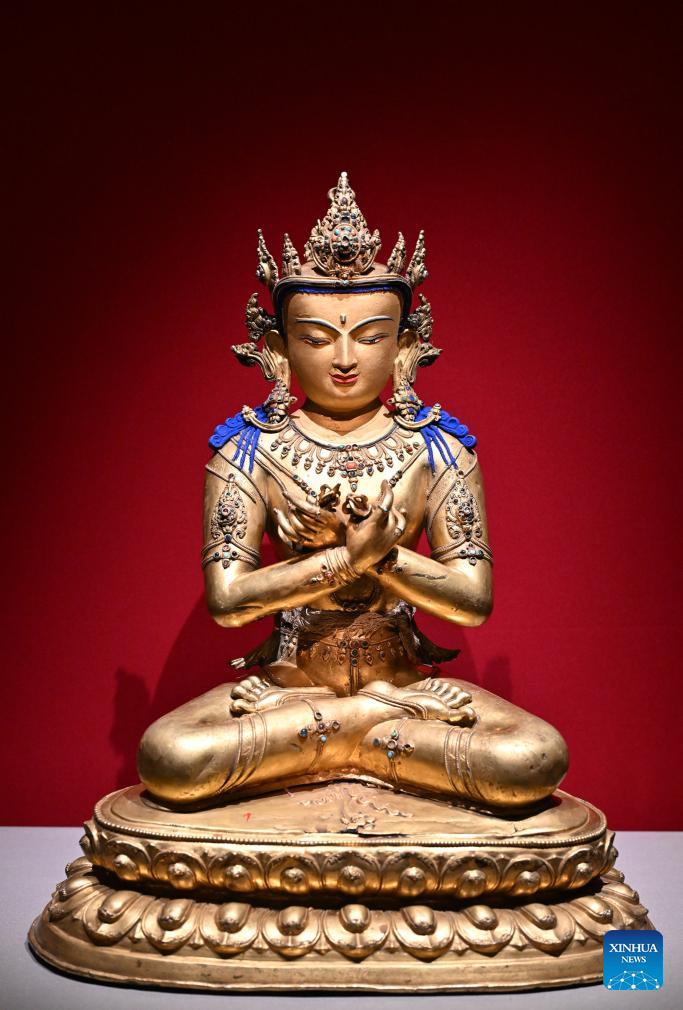 An exhibit is pictured during a preview of the exhibition "Beyond Time: the history, culture and art of Sakya Monastery" at the Palace Museum in Beijing, capital of China, Feb. 9, 2026. The exhibition, which will last till May 10, showcases over 200 relics reflecting the history, culture and art of Sakya Monastery, the earliest monastery of the Sakya Sect of the Tibetan Buddhism. [Photo/Xinhua]