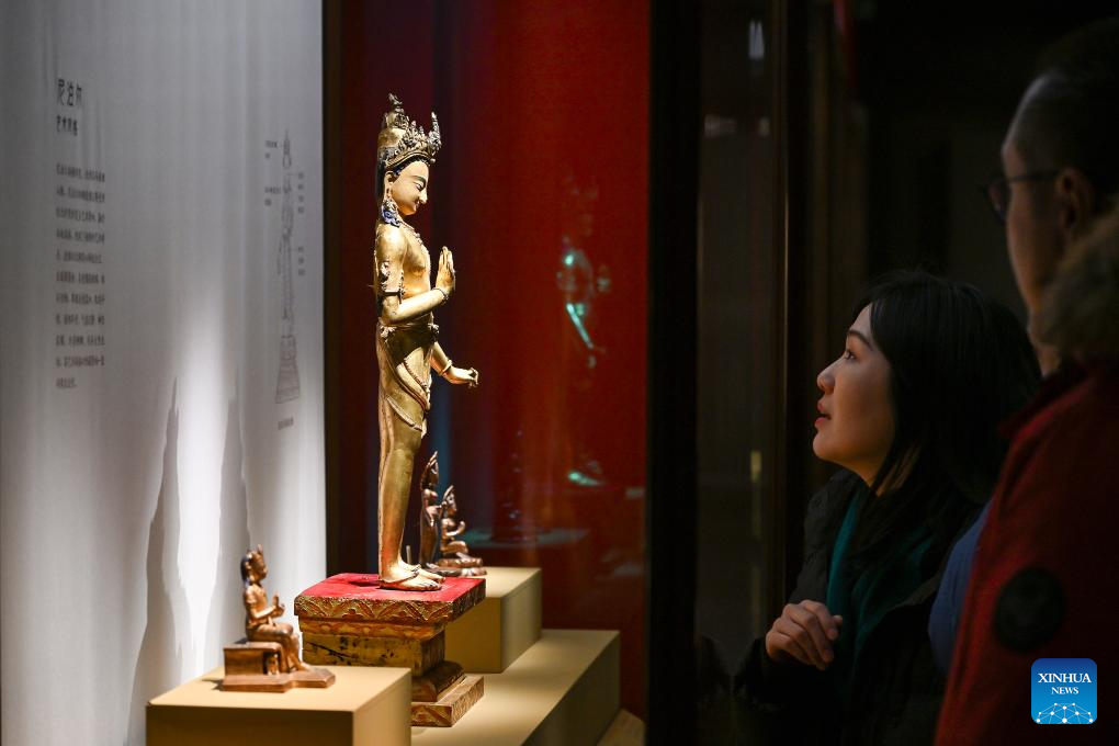 People visit the exhibition "Beyond Time: the history, culture and art of Sakya Monastery" at the Palace Museum in Beijing, capital of China, Feb. 9, 2026. The exhibition, which will last till May 10, showcases over 200 relics reflecting the history, culture and art of Sakya Monastery, the earliest monastery of the Sakya Sect of the Tibetan Buddhism. [Photo/Xinhua]