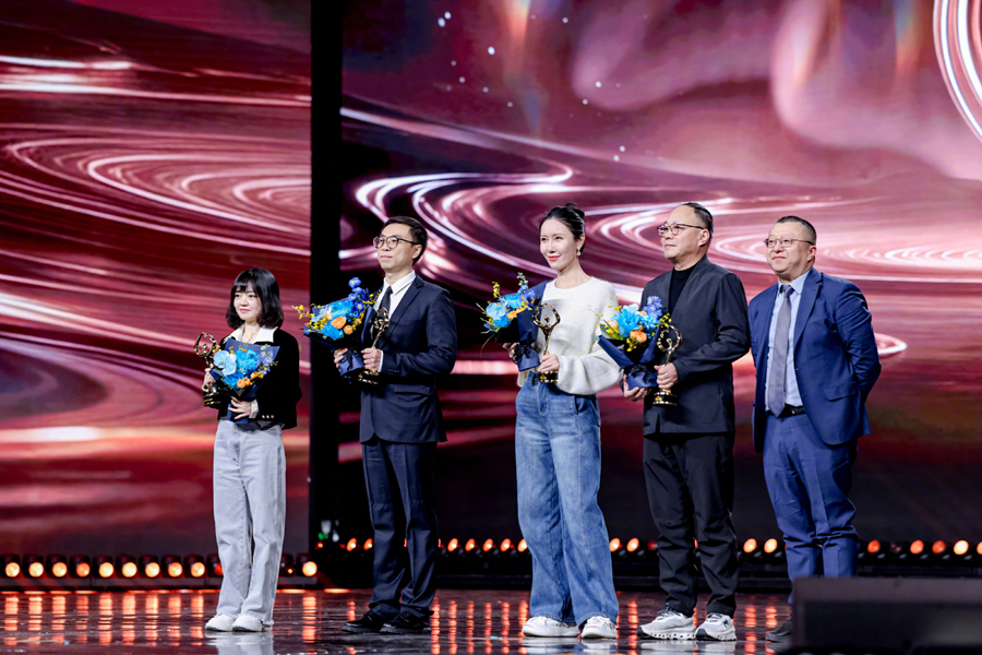 Film executives and distributors receive the Weibo Movie of the Year award on stage at the 2025 Weibo Night in Beijing, Feb. 5, 2026. [Photo courtesy of Weibo]