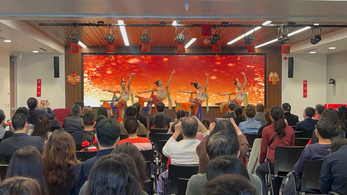Local residents watch a dance titled "Colorful Dunhuang" by Xiaopei Dance Troupe at the mini photo exhibition in San Jose, California, Feb. 8, 2026. [Photo provided to China.org.cn]