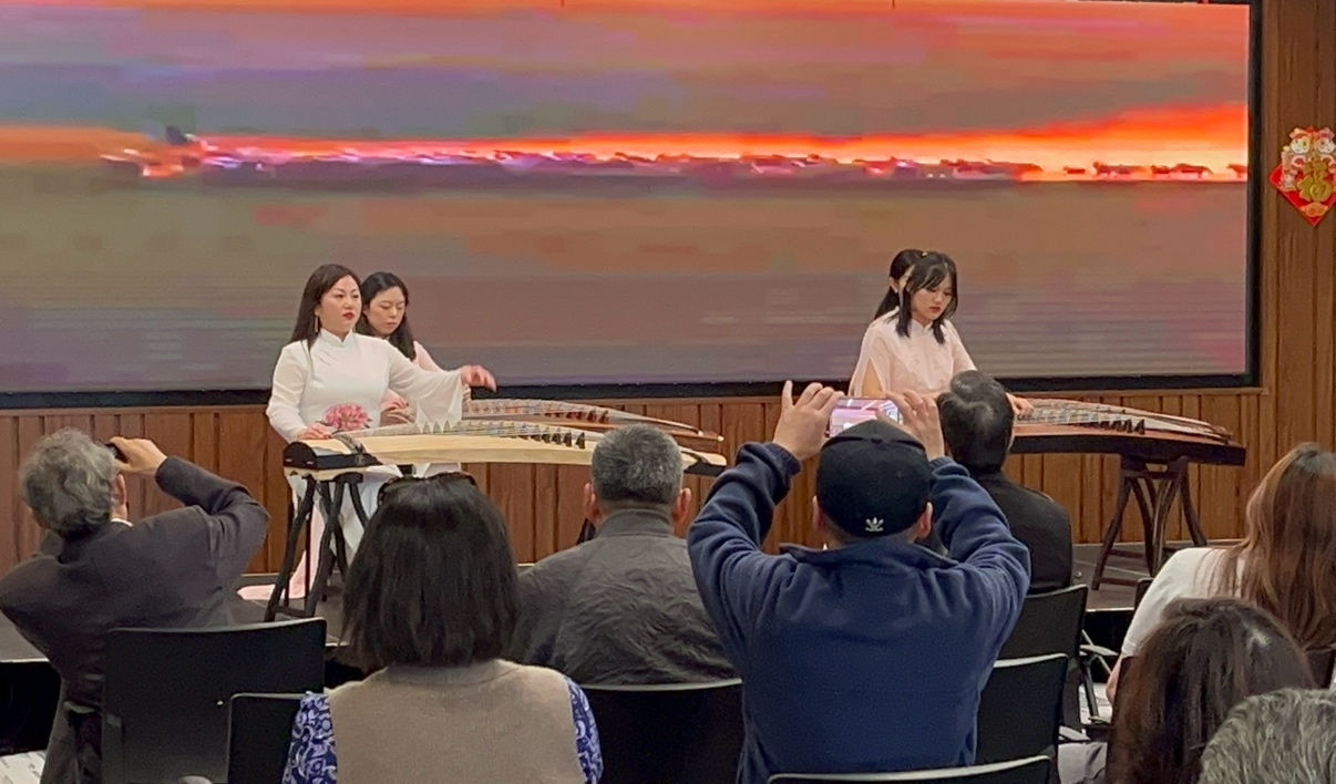 Local residents listen to a guzheng performance at the mini photo exhibition in San Jose, California, Feb. 8, 2026. [Photo provided to China.org.cn]