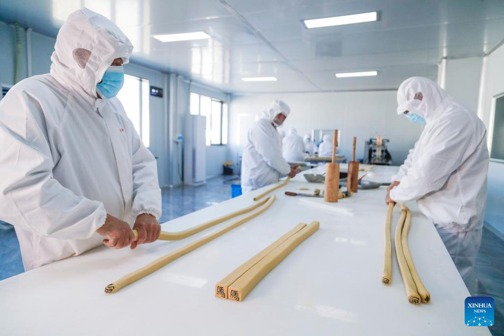 Staff members make character-inlaid candies in Qimen County of Huangshan City, east China's Anhui Province, Jan. 13, 2026.