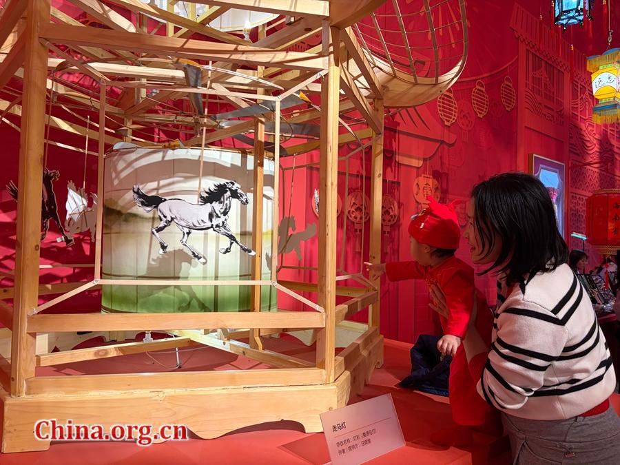 A child admires a revolving lantern at the Spring Festival-themed exhibition at the Chinese Traditional Culture Museum, Beijing, Feb. 10, 2026. [Photo by Yang Chuanli/China.org.cn]