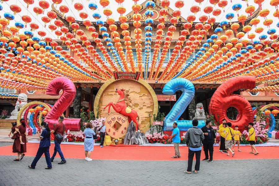 People walk past an installation celebrating the Chinese New Year in Medan, North Sumatra, Indonesia, Feb. 17, 2026. [Photo/Xinhua]