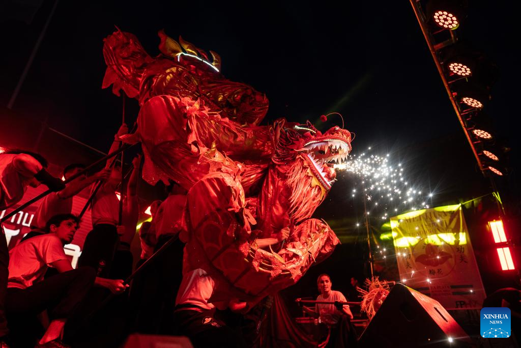 Dragon dancers perform during a Chinese New Year celebration event in La Plata, Buenos Aires, Argentina, Feb. 21, 2026. A series of activities to celebrate the Chinese New Year were held here on Saturday, attracting large numbers of local residents. [Photo/Xinhua]