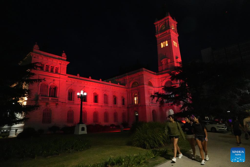 The municipal government building of La Plata is illuminated in red in Buenos Aires, Argentina, Feb. 21, 2026. A series of activities to celebrate the Chinese New Year were held here on Saturday, attracting large numbers of local residents. [Photo/Xinhua]