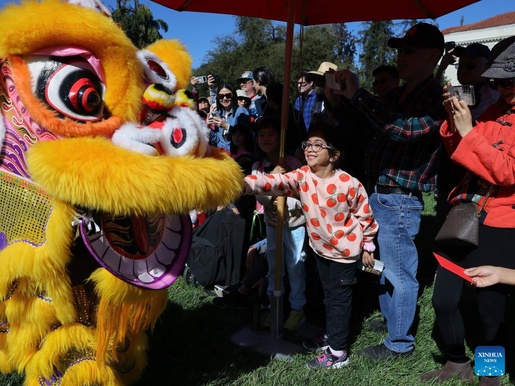 Lion dancers interact with the audience at the Huntington Library, Art Museum, and Botanical Gardens in San Marino, Los Angeles County, California, the United States, on Feb. 21, 2026. The Chinese New Year was celebrated at the Huntington Library with arts and crafts, music and a lion dance performance. [Photo/Xinhua]