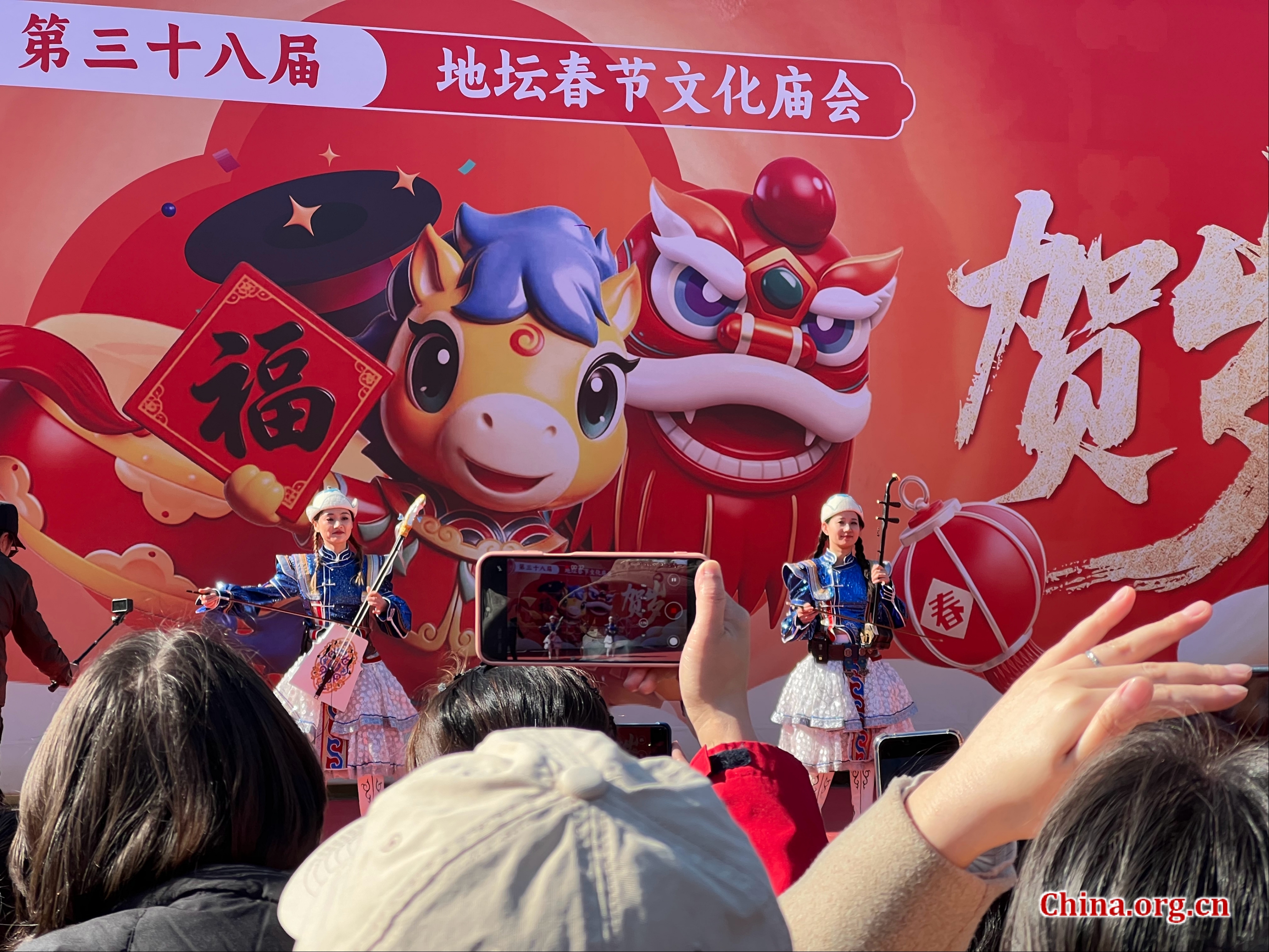 Artists play ethnic musical instruments on stage at the 38th Ditan Park Temple Fair in Beijing, Feb. 17, 2026. [Photo by Li Congrong/China.org.cn]