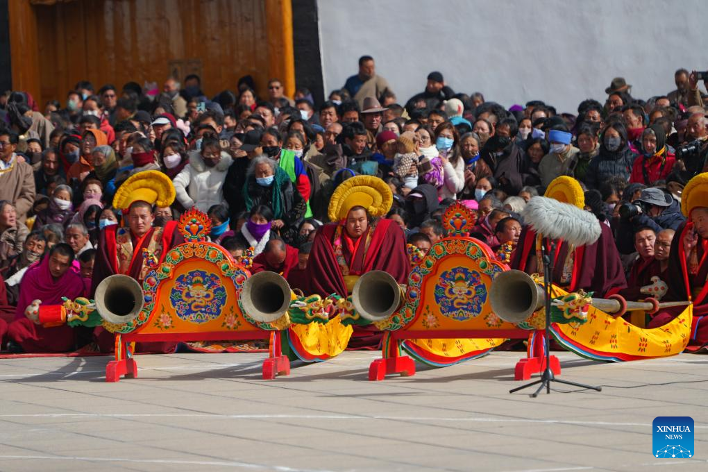 Lamas play traditional musical instruments during an exorcism dance performance in a square at the Labrang Monastery in Xiahe county, northwest China's Gansu province, on March 2, 2026. The annual event of exorcism dance to pray for good luck in the new year was held on Monday. Built in 1709, Labrang Monastery is one of the six great monasteries of the Gelug Sect of Tibetan Buddhism. [Photo/Xinhua]