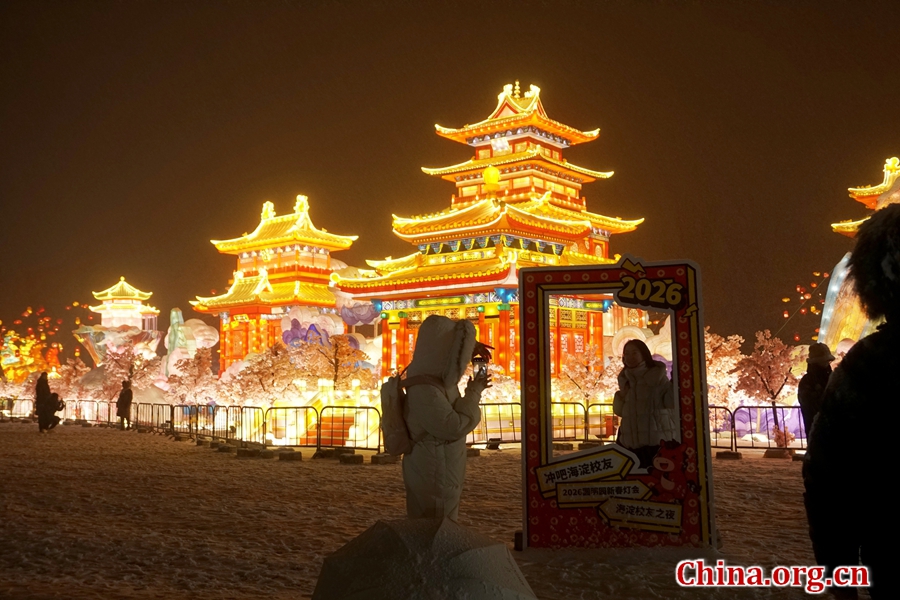 Visitors take photos with a "Haidian Alumni Night" event custom photo prop board at the Lantern Fair in Yuanmingyuan, Mar. 4, 2026. [Photo by Li Congrong/China.org.cn]