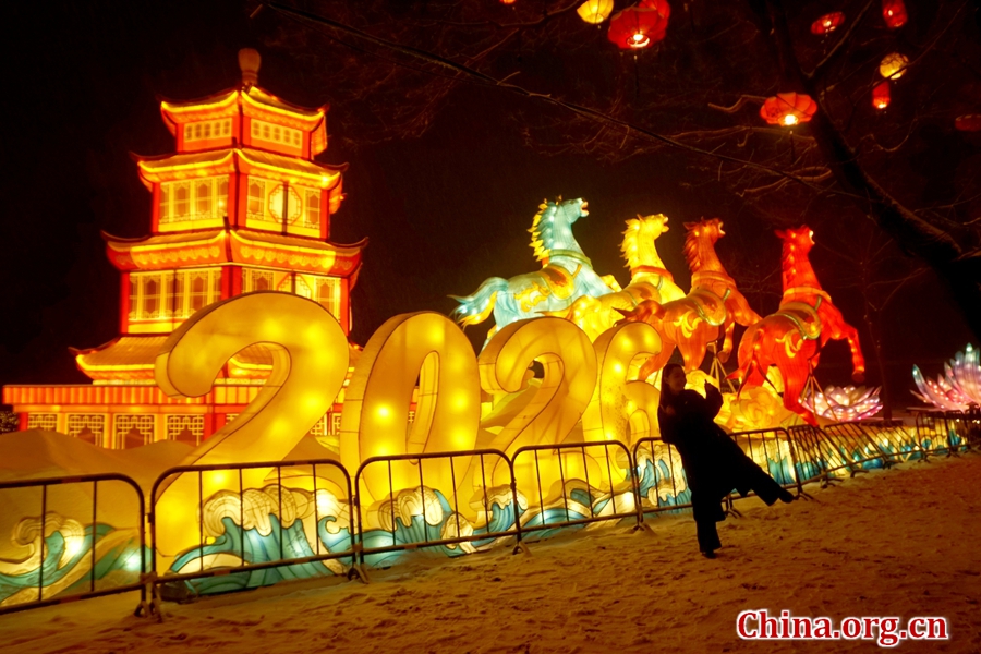 A visitor poses for photos with a huge "2026" lantern at the Lantern Fair in Yuanmingyuan, Mar. 4, 2026. [Photo by Li Congrong/China.org.cn]