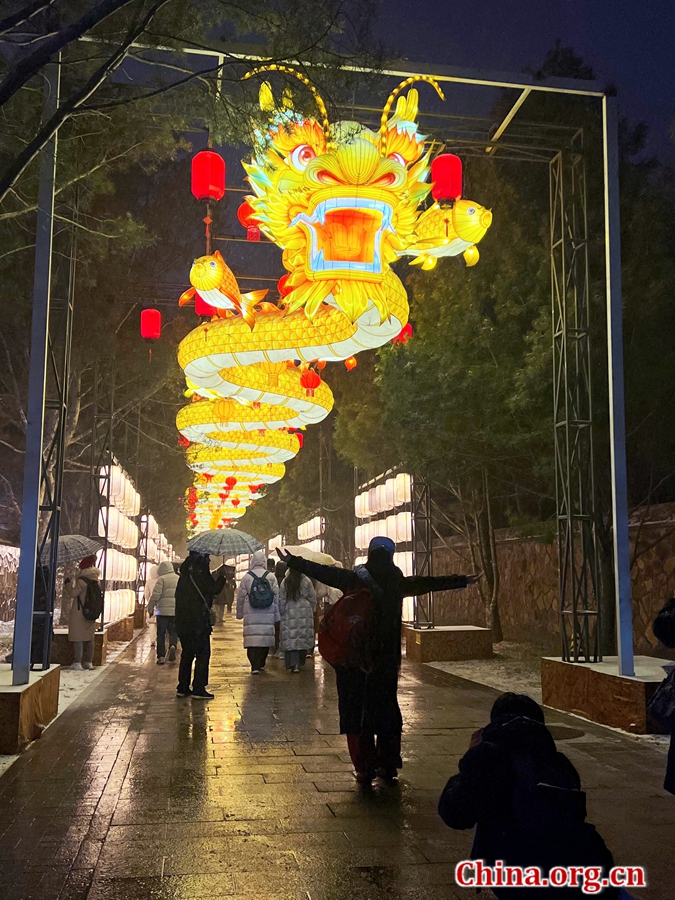 A lady poses for photos with the giant dragon lantern at the Yuanmingyuan Lantern Fair in Beijing, Mar. 4, 2026. [Photo by Li Congrong/China.org.cn]