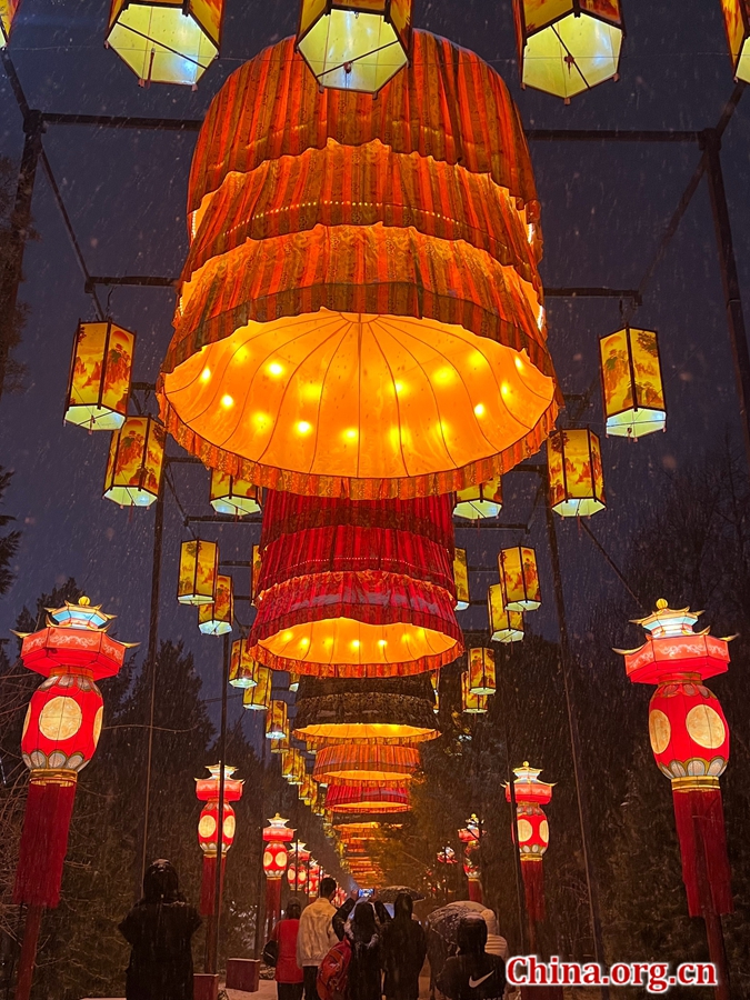 Beijing Yuanmingyuan Park hosts both visitors and a lantern show amid heavy snowfall