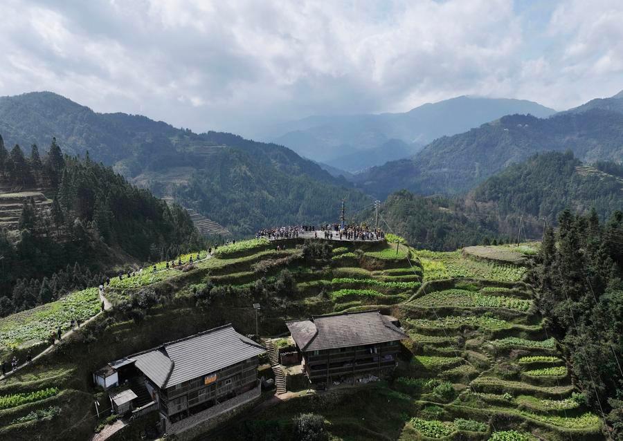 People walk toward a fair celebrating the "pohui" festival in Gandong township of Rongshui Miao autonomous county, Liuzhou city, south China's Guangxi Zhuang autonomous region, Feb. 23, 2026. [Photo/Xinhua]