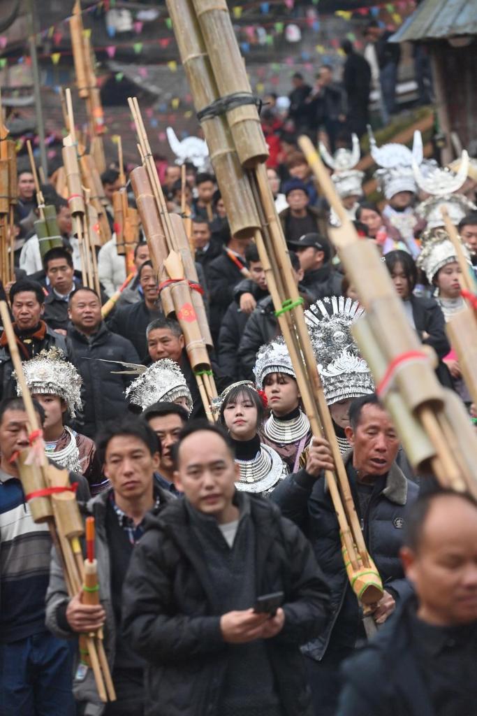 People attend a fair celebrating the "pohui" festival in Gandong township of Rongshui Miao autonomous county, Liuzhou city, south China's Guangxi Zhuang autonomous region, Feb. 21, 2026. [Photo/Xinhua]