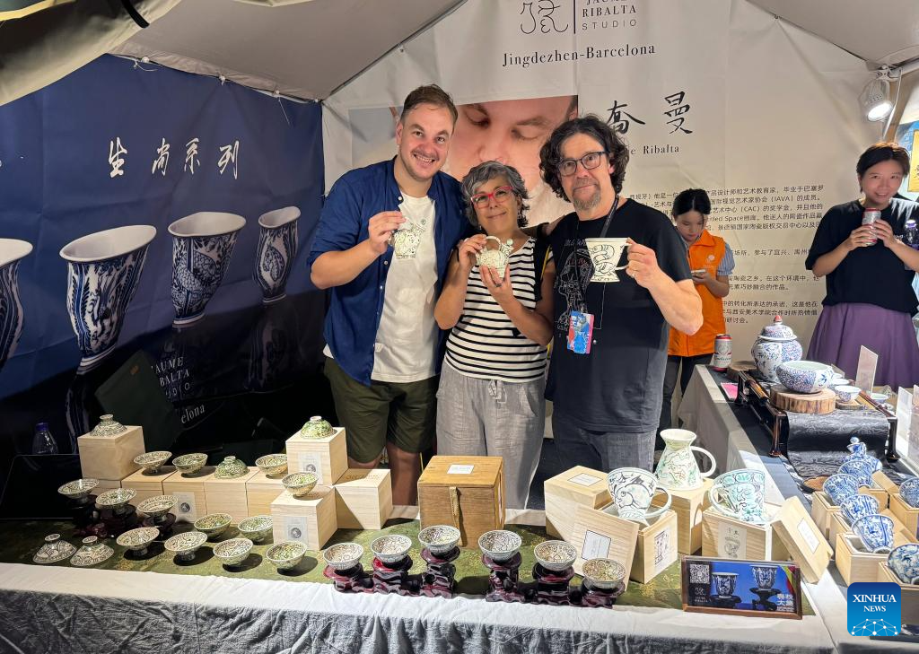 This file photo shows Jaume Ribalta (1st L) and his friends displaying porcelain works at a fair in Jingdezhen City, east China's Jiangxi Province, in October 2024. [Photo/Xinhua]