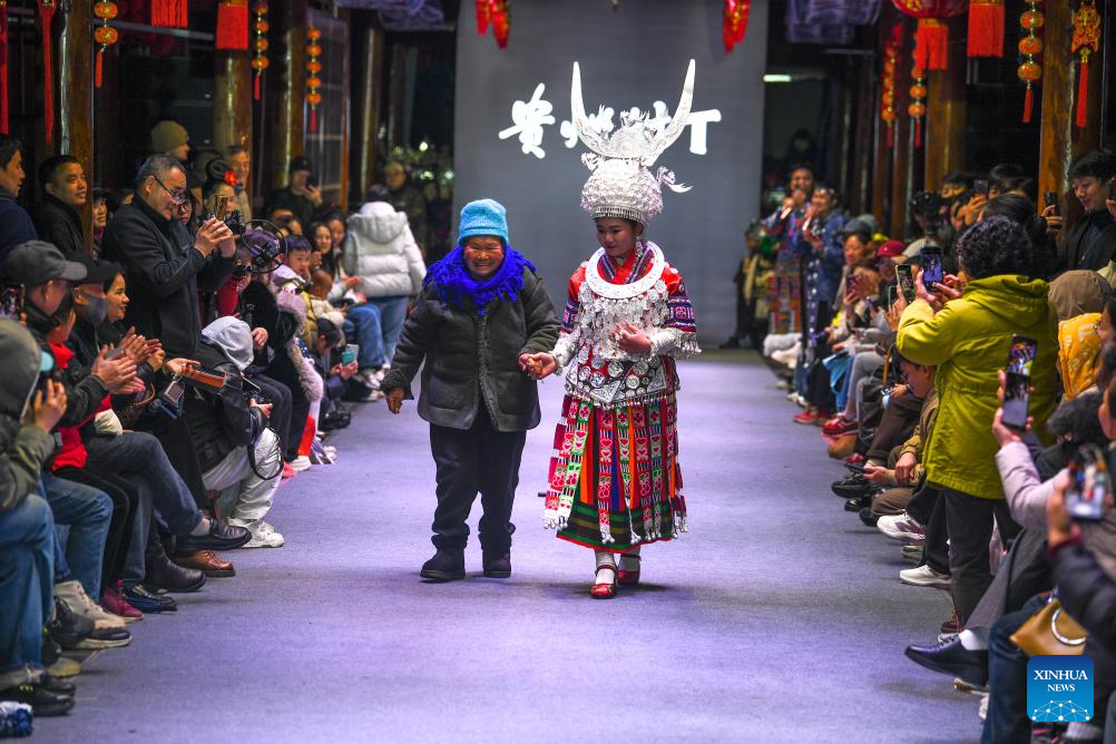 Models present traditional costumes during a "Village T" fashion show in Kaili, Qiandongnan Miao and Dong Autonomous Prefecture, southwest China's Guizhou Province, on March 8, 2026. Embroiderers from Qiandongnan Miao and Dong Autonomous Prefecture participated in the "Village T" fashion show to showcase colorful ethnic costumes. [Photo/Xinhua]