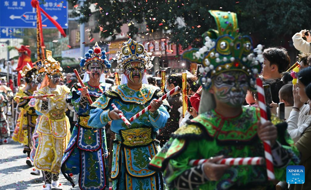 This photo taken on March 11, 2026 shows a Yingge dance, or "dance to the hero's song," during the Chenghuang temple fair in Jieyang, south China's Guangdong Province. The Chenghuang temple fair, held on the 23rd day of the first month on the traditional Chinese calendar, is one of the major traditional folk cultural events in Jieyang. (Xinhua/Deng Hua)