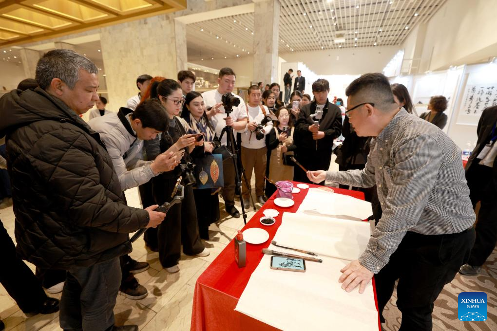 A Chinese painter interacts with visitors at a Chinese painting exhibition on the theme of "horse" in Bishkek, Kyrgyzstan, on March 10, 2026. The exhibition opened here on Tuesday, showcasing about 50 works on horses in different styles by renowned Chinese painters. (Photo by Roman/Xinhua)