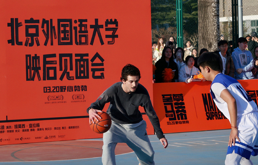 Actor Timothée Chalamet plays basketball with students at Beijing Foreign Studies University in Beijing, March 11, 2026. [Photo courtesy of Wanda Film]
