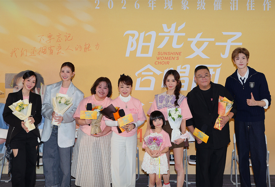 Cast and crew of "Sunshine Women's Choir" pose for a photo at a screening of the film in Beijing, March 30, 2026. [Photo courtesy of Wanda Film]