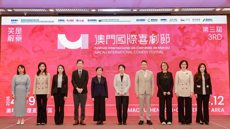 Government officials and organizers on stage at the press conference for the 3rd Macao International Comedy Festival in Macao, China, April 1, 2026. [Photo courtesy of Mahua Fun Age]