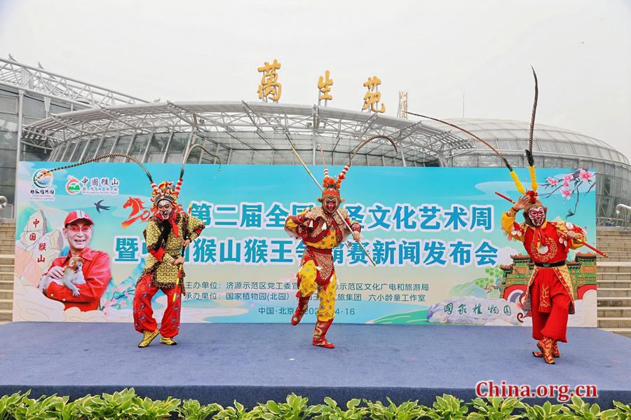 Actor Liu Xiaolingtong, organizers and local leaders from Jiyuan, Henan province, launch the 2026 China Monkey Mountain Monkey King Competition and second Great Sage Cultural Arts Week in Beijing, April 16, 2026. [Photo/China.org.cn]