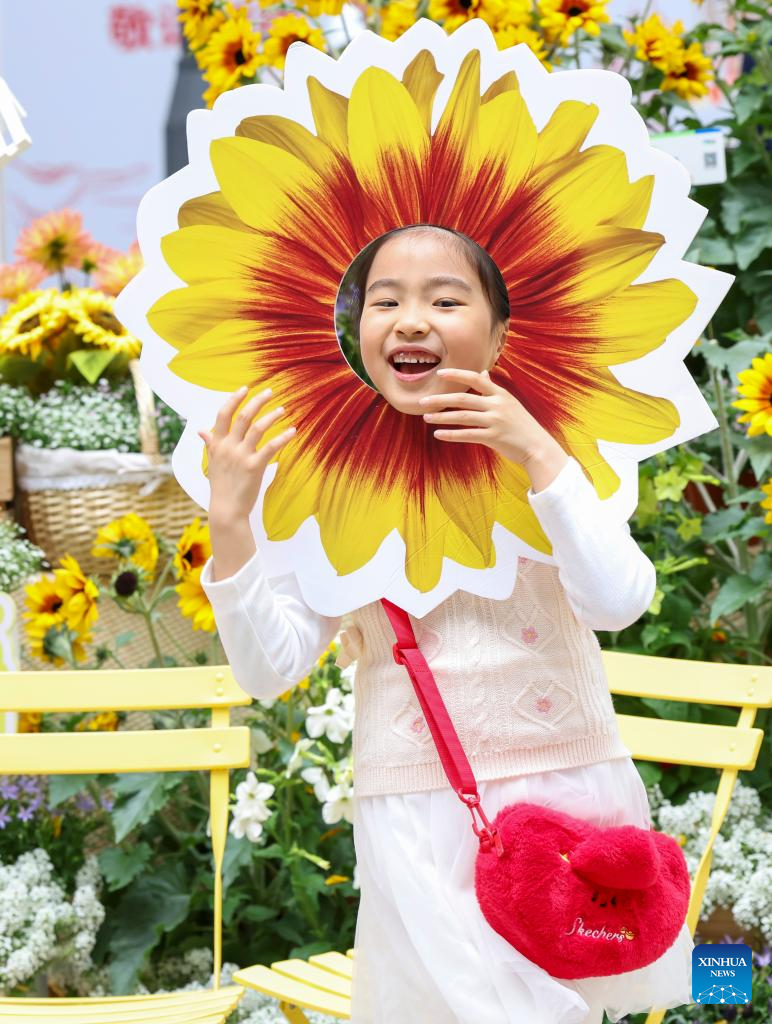 A girl poses for photos at a flower fair in Huangpu District of Shanghai, east China, April 18, 2026. The 2026 Shanghai International Flower Show opened on Saturday with events in two main venues, 10 sub-venues and multiple exhibition spots across the city. (Xinhua/Chen Haoming)