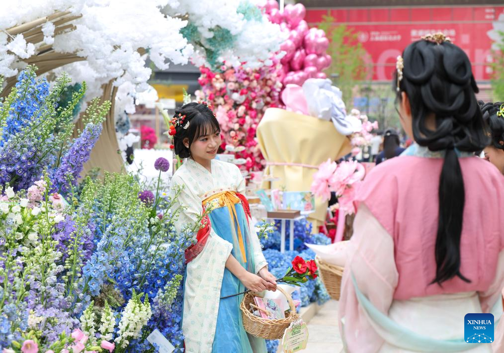 Staff members take photos at a flower fair in Huangpu District of Shanghai, east China, April 18, 2026. The 2026 Shanghai International Flower Show opened on Saturday with events in two main venues, 10 sub-venues and multiple exhibition spots across the city. (Xinhua/Chen Haoming)