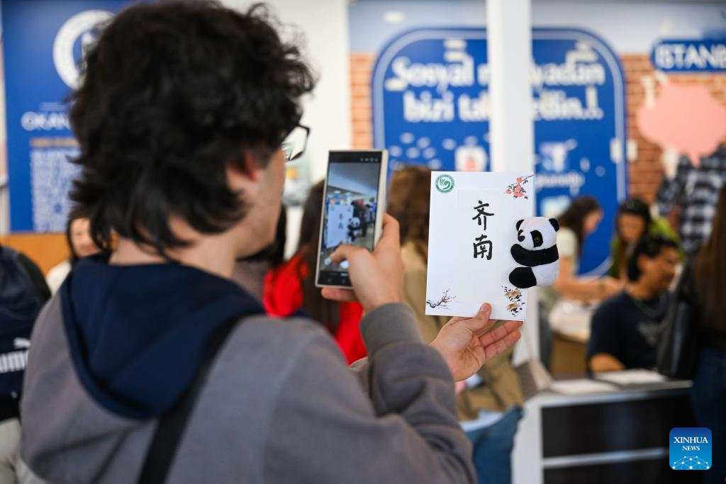 A university student takes a photo of his Chinese name at Okan University in Istanbul, Türkiye, on April 20, 2026. The Confucius Institute at Okan University in Istanbul, Türkiye, hosted a variety of activities to celebrate the International Chinese Language Day on Monday. [Photo/Xinhua]