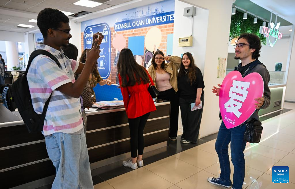 A university student poses for a photo holding a Chinese-language display board at Okan University in Istanbul, Türkiye, on April 20, 2026. The Confucius Institute at Okan University in Istanbul, Türkiye, hosted a variety of activities to celebrate the International Chinese Language Day on Monday. [Photo/Xinhua]