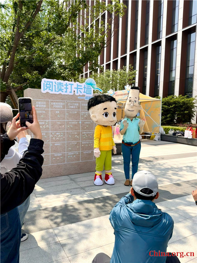Visitors take photographs of costumed performers dressed as characters from the cartoon "Big Head Son and Small Head Dad" at the China Publishing Group Reading Week Cultural Market in Beijing, April 23, 2026. [Photo by Liu Caiyi/China.org.cn]