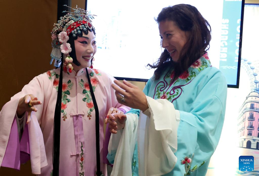 A woman interacts with a Kunqu Opera performer during a Shanghai city promotion event in London, Britain, on April 24, 2026.