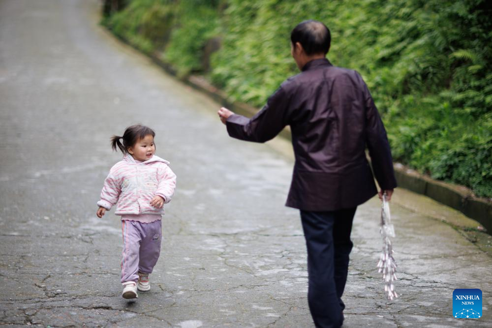 A silversmith carrying a silver ornament talks with a little girl in Shuikou Township of Liping County, southwest China's Guizhou Province, April 21, 2026.