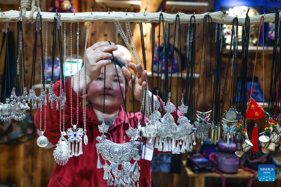 A shop owner sorts silver cultural and creative products in Zhaoxing Dong Village of Liping County, southwest China's Guizhou Province, April 21, 2026.