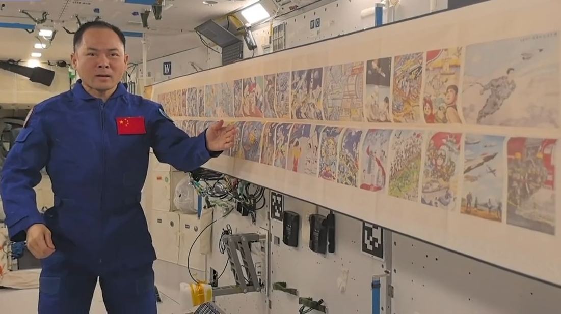 An art exhibition featuring 80 pieces of paintings by teenagers was held simultaneously on Wednesday aboard China's orbiting space station, which is orbiting about 400 kilometers above Earth, and at the Capital Museum in Beijing.