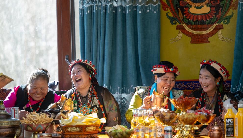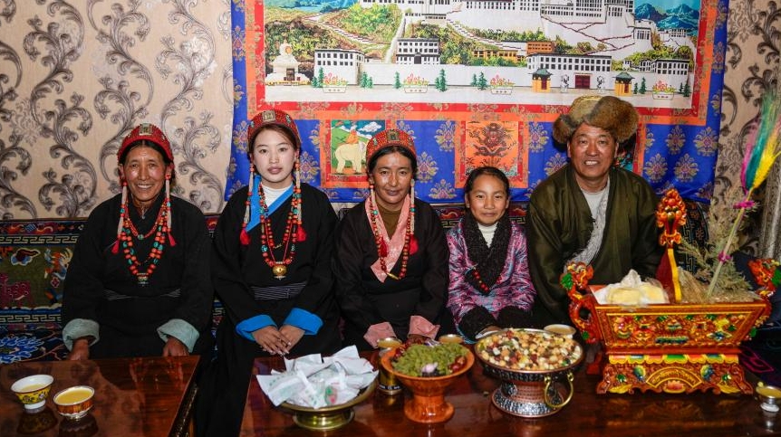 In Khorchak Village of Burang County, Jamyang Drolma's family is bustling with New Year preparations at home. A pot of "Gutu" steams on the stove, while the "chema," a two-tier rectangular wooden box containing roasted barley and fried wheat grain, is placed to pray for harvest in the next year.