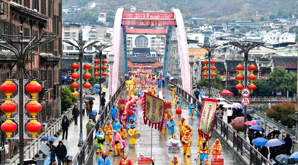 People attend a parade during the "Maolong Festival" of Yilao ethnic group in Shiqian County, southwest China's Guizhou Province, Feb. 27, 2026.