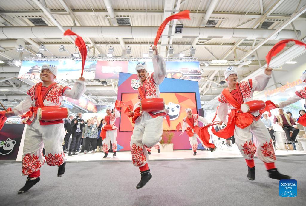 Actors from China's Shaanxi Province perform waist drum dance at the booth of China during the ITB Berlin travel trade show in Berlin, Germany, March 5, 2024. The ITB Berlin travel trade show kicked off here on Tuesday and will last until March 7. (Xinhua/Ren Pengfei)