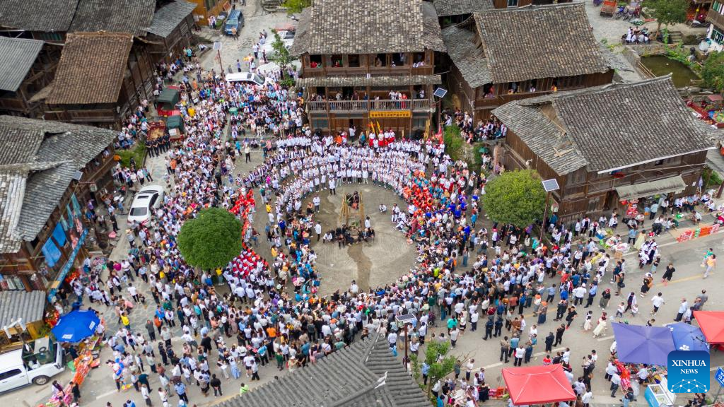 An aerial drone photo taken on July 20, 2024 shows an event held in Huanggang Village, Qiandongnan Miao and Dong Autonomous Prefecture, southwest China's Guizhou Province. [Photo/Xinhua]