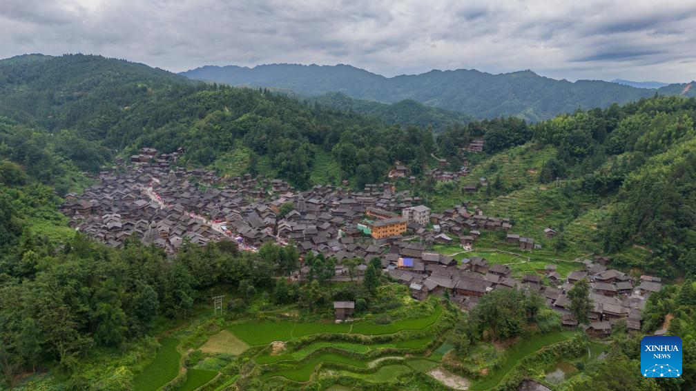 An aerial drone photo taken on July 20, 2024 shows a panoramic view of the Huanggang Village in Qiandongnan Miao and Dong Autonomous Prefecture, southwest China's Guizhou Province. [Photo/Xinhua]